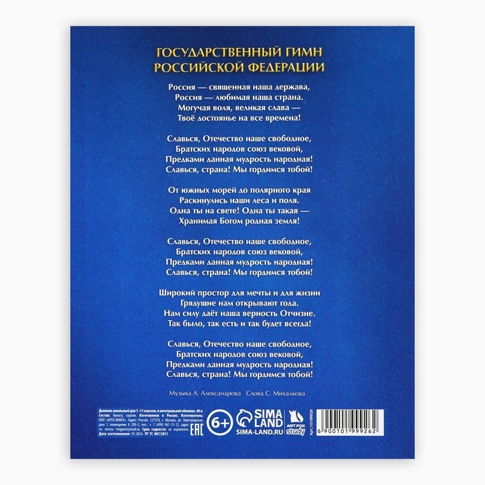 Дневник школьный для 1-11 класса, в интегральной обложке, 40 л. «Россия. Синий»