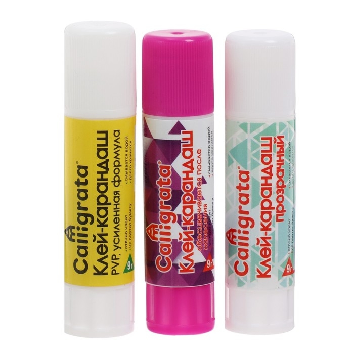 Клей-карандаш 9 грамм, набор 3 штуки, (PVP, PVA,PVA цветной)