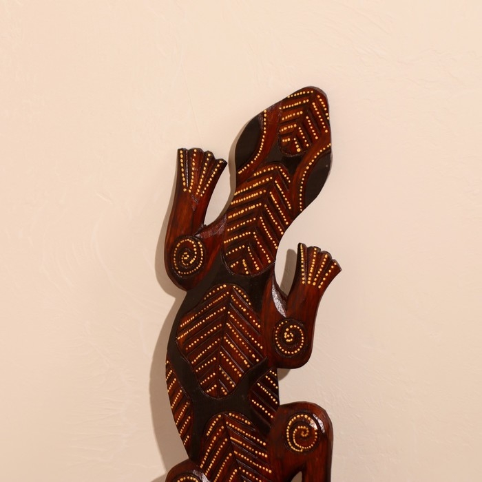 Не каждый осмелится разместить такое панно ручной работы в своем интерьере. Ведь порой кажется, что это настоящая живая рептилия. Искусные индонезийские мастера изобразили всё настолько детализировано четко, что хочется прикоснуться к панно дерево "Геккон" 50х13х1 см и ощутить тонкие линии изгибов этой «ящерицы счастья».