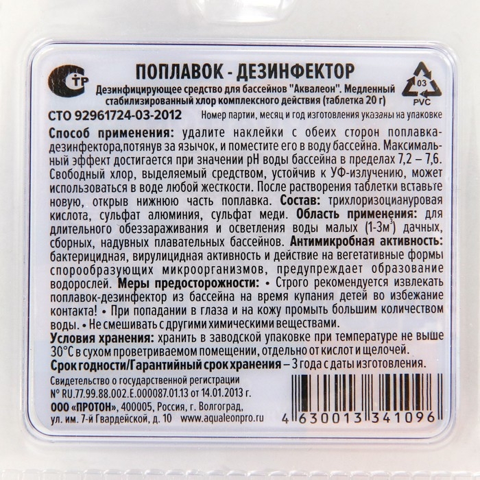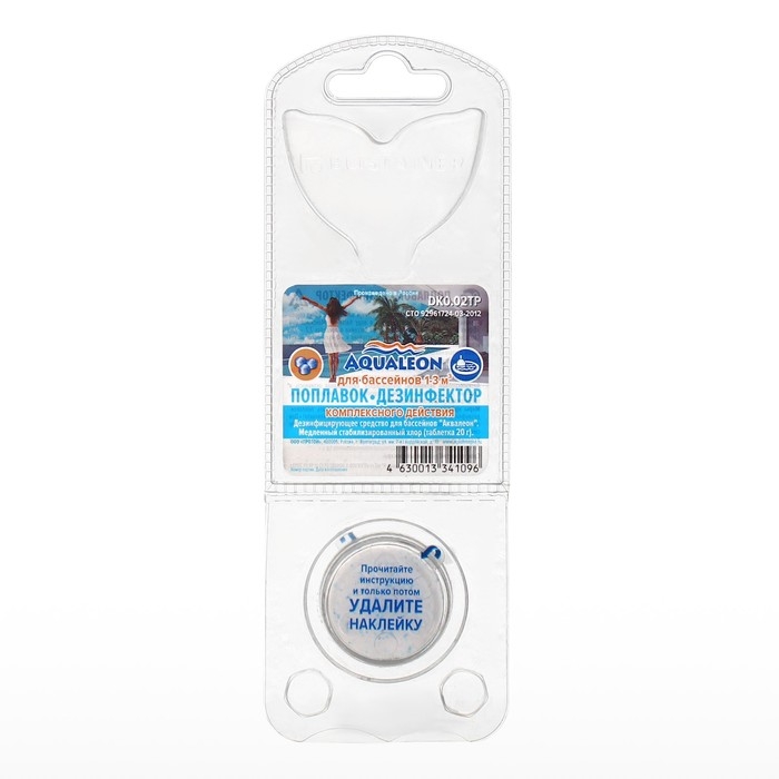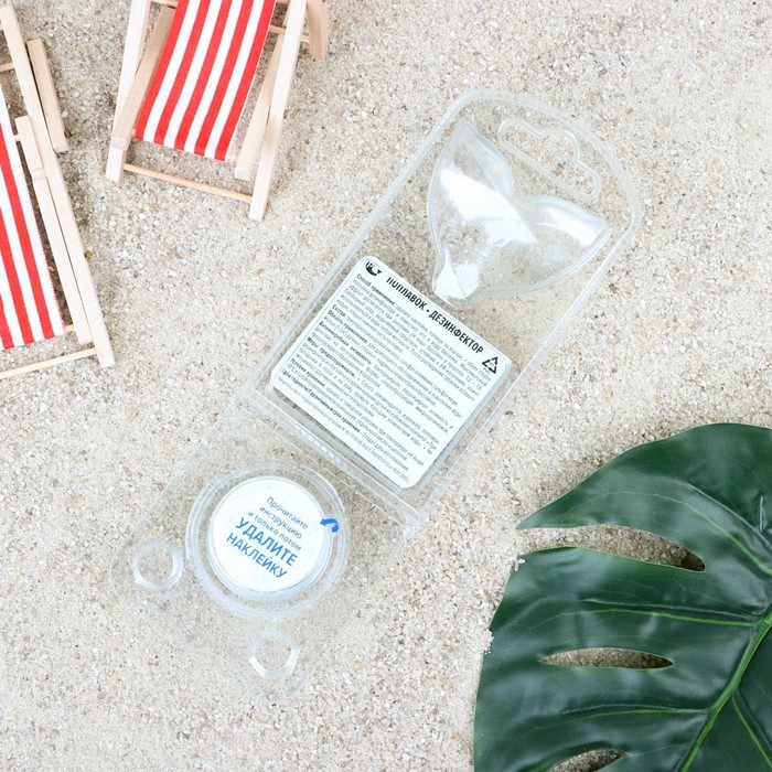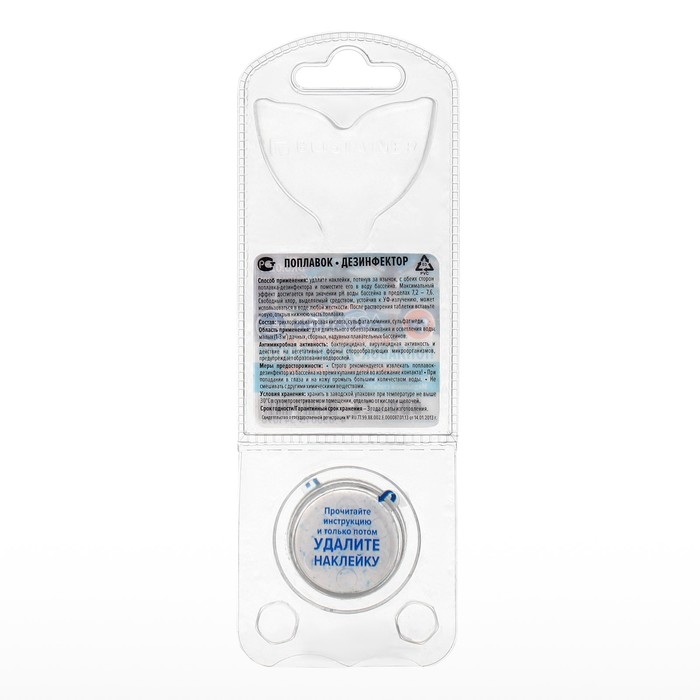 Меры предосторожности: строго рекомендуется извлекать поплавок-дезинфектор из бассейна на время купания детей во избежание контакта. При попадании в глаза и на кожу, промыть большим количеством воды. Не смешивать с другими химическими веществами.
