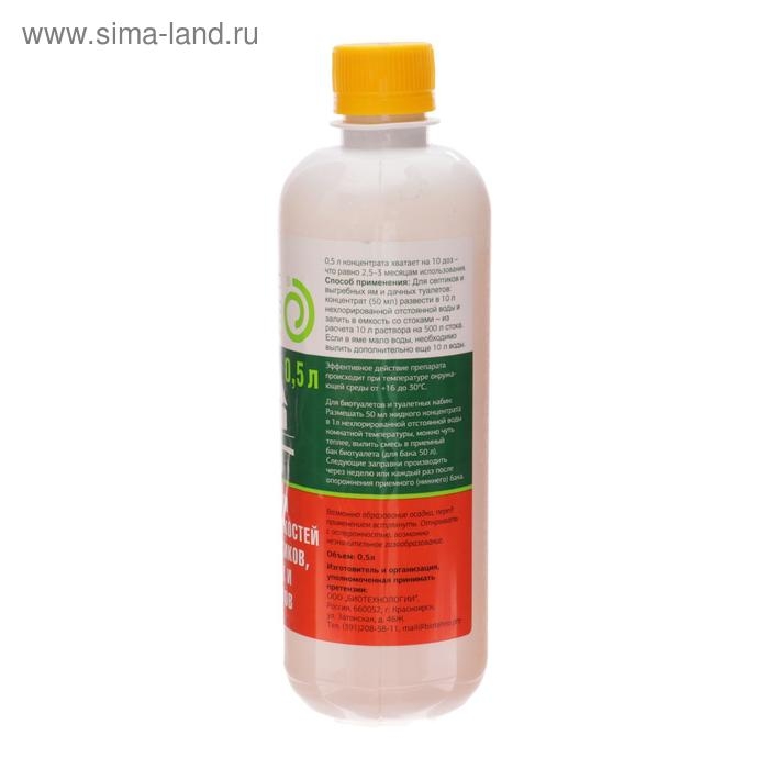 Препарат активизирует переработку содержимого накопительных баков биотуалетов, септиков и выгребных ям. Средство в кратчайшие сроки устраняет неприятные запахи, предотвращает развитие болезнетворных бактерий, подавляет патогенную микрофлору и очищает внутреннюю поверхности резервуаров. Снижает газообразование, замедляет развитие гнилостных процессов. 0,5 концентрата разводят на 10 доз, которые используют в течение 3 месяцев.