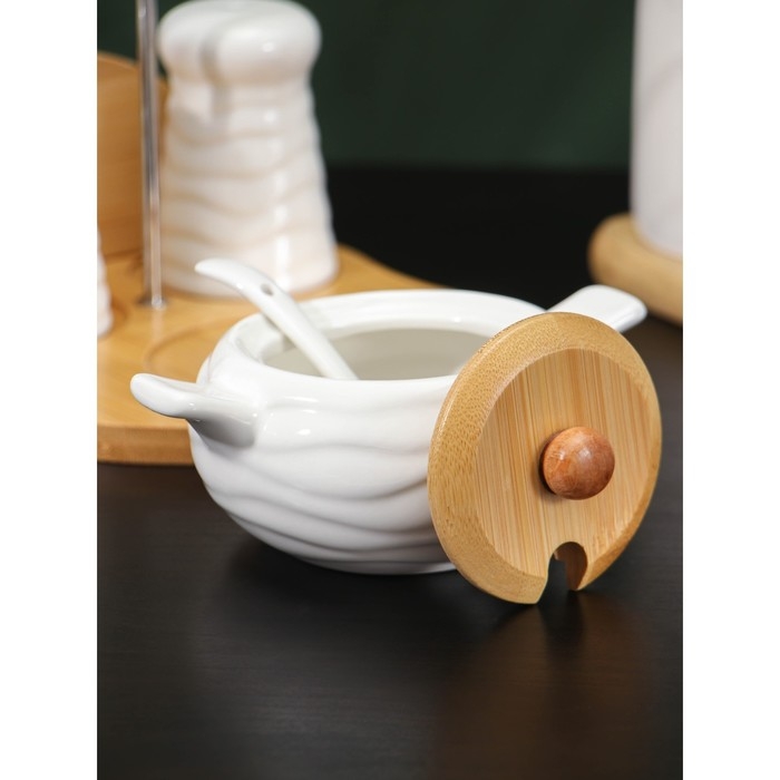 Набор для специй на деревянной подставке BellaTenero, 4 предмета: солонка 70 мл, перечница 70 мл, сахарница 250 мл, салфетница, цвет белый