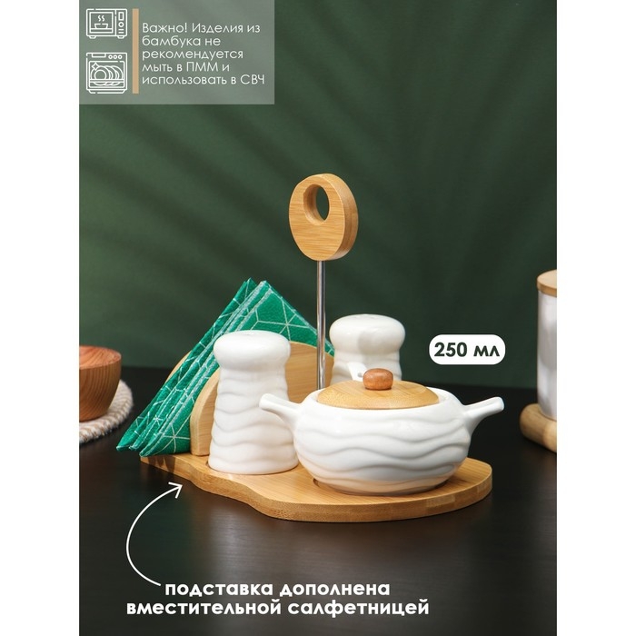 Набор для специй на деревянной подставке BellaTenero, 4 предмета: солонка 75 мл, перечница 75 мл, салфетница, ёмкость для зубочисток, цвет белый