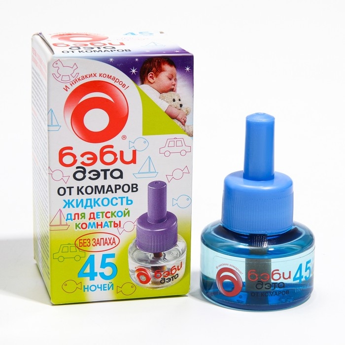Жидкость от комаров и летающих насекомых для фумигатора, детский, ДЭТА БЭБИ незаменима для уничтожения комаров и других летающих насекомых (москитов, мошек, мух) в детской комнате.Специально разработанная рецептура, без запаха, гарантирует безопасность и эффективность использования. Подходит для малышей с двух лет. В составе натуральный пиретрин – экстракт далматской ромашки, природный инсектицид, безопасный для детей и беспощадный в борьбе с комарами.Один флакон жидкости обеспечивает крепкий сон ребёнка без надоедливых комаров на протяжении 45 ночей!Полное уничтожение комаров уже через 1 час после начала работы фумигатора. Жидкость подходит к большинству электрофумигаторов. Максимальный эффект достигается при использовании жидкости в комплекте с фумигатором БЭБИ ДЭТА.Для защиты от комаров и борьбы с другими насекомыми в ассортименте бренда ДЭТА представлена широкая линейка средств: для использования на улице и для домашнего использования; товары подходят для детей и взрослых. Со средствами бренда ДЭТА ваши любимые активности на природе – прогулка и пикник в парке или в лесу, выезд на природу, на дачу, в поход, на рыбалку, охоту, за грибами или на фестиваль пройдут без комаров.Для детской кожи особенно важно использовать безопасные средства от комаров. В ассортименте бренда БЭБИ ДЭТА есть спреи и аэрозоли, которые подходят для малышей и младенцев уже с 9 месяцев. Средства содержат пантенол, алоэ вера, аллантоин, в состав входит также ромашка и другие натуральные компоненты, которые помогают смягчить и увлажнить кожу, предотвращая раздражение от укусов комаров и других насекомых. Также для безопасного детского использования мы разработали браслеты и клипсы от комаров, которые удобно использовать во время прогулок на свежем воздухе.Торговая марка ДЭТА предлагает самые удобные формы средств помощи против насекомых - вредителей: аэрозоль, спрей, крем, молочко, гель, комплект (набор) фумигатор и жидкость или пластины (таблетки), стержни, спирали. Они содержат отпугивающие вещества и эффективно отгоняют комаров, а также других вредителей.Большинство средств содержат активные компоненты – дэта (диэтилтолуамид) или ir3535 - эффективное против насекомых вещество, которое безопасно для использования в соответствии с инструкцией по применению к средству (это справедливо в т.ч. для бытовой химии, косметических средств, репеллентов и инсектицидов).Мы также рекомендуем попробовать средства ДЭТА против клещей (в т.ч. иксодовых клешей), мошек, мокрецов, слепней, москитов, ос, клопов, блох, мух, тараканов и других летающих насекомых. Продукты ДЭТА защитят ваш дом от назойливых насекомых, обеспечат приятную и беззаботную прогулку на свежем воздухе и отдых на даче для всей семьи. Состав:натуральные пиретрины (0,025%), трансфлутрин (0,1%), праллетрин (0,5%); растворитель.