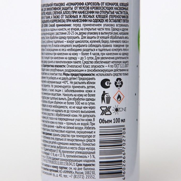 - Защита от клещей: специальные компоненты аэрозоля помогают предотвратить проникновение клещей на кожу, что особенно важно в период активной активности этих насекомых.