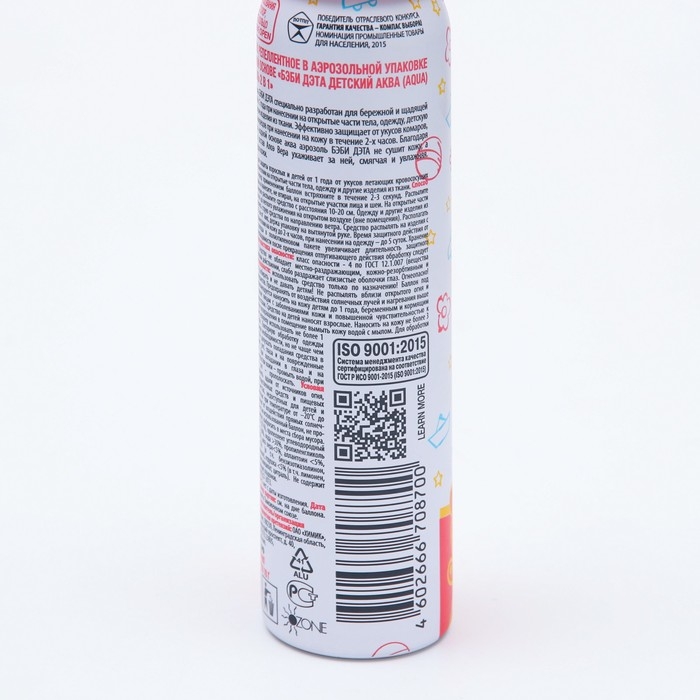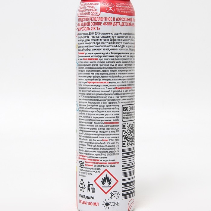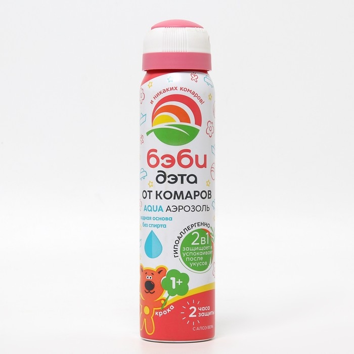 Аэрозоль обеспечивает защиту в течение двух часов — как раз на время прогулки. Особый состав 2 в 1 оберегает и успокаивает нежную кожу малыша, не содержит спирта. Его можно использовать для обработки коляски и детской одежды.Продукция «Дэта Аква» создаётся на уникальной водной основе, в отличие от обычных спиртовых средств.Не сушат кожу.Обладают приятным натуральным ароматом апельсина.Благодаря входящему в состав маслу пихты ухаживают за кожей при нанесении.Не содержат спирта.Современные репелленты «Дэта» безвредны для людей и моментально уничтожают таких насекомых, как комары, мошки, клещи, слепни, мокрецы. Они обеспечат вам комфортный летний отдых на свежем воздухе и в помещении.«Бэби Дэта» создана специально для защиты малышей от 1 года. Все средства этой марки имеют лёгкую текстуру и содержат алоэ вера, что делает их подходящими для ребёнка.Новые разработки и исследования проводятся каждый год, что позволяет создавать качественную и безопасную продукцию. Состав: 10% ИР3535 (этил-3-N-бутилацетамидо-пропионат), пропиленгликоль, аллантоин, алоэ вера, консервант, отдушка, вода, пропеллент углеводородный.