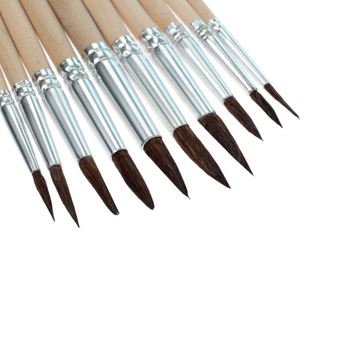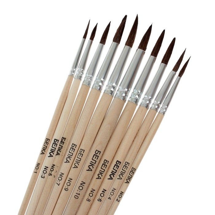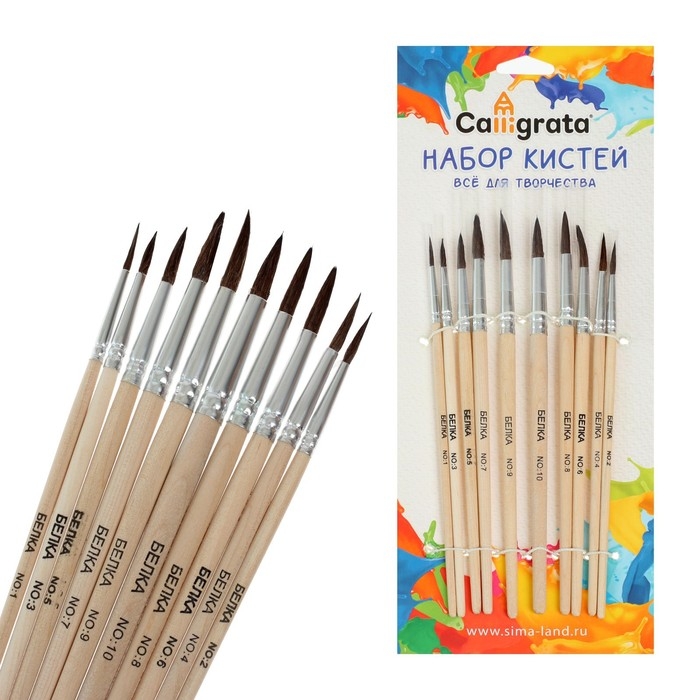 Набор кистей белка, Calligrata, круглые, 10 штук (№1,2,3,4,5,6,7,8,9,10) с деревян ручками, в блистере