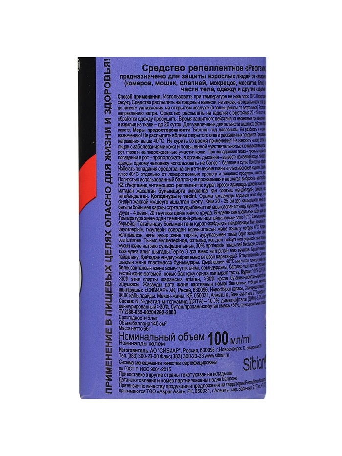Способ применения: Использовать при температуре не ниже плюс 10°С. Перед применением баллон встряхивать в течение 2-3 секунд. Средство распылить на ладонь и нанести, не втирая, на открытые части тела; одежду и другие изделия из ткани обрабатывать до легкого увлажнения на открытом воздухе (в защищенном от ветра месте). Располагать одежду и направлять струю средства по направлению ветра. Средство распылять на изделия с расстояния 20-25 см от них, держа упаковку на вытянутой руке. После обработки одежду просушить. Время защитного действия: от насекомых при нанесении на кожу - до 4 часов, при нанесении на одежду и изделия из ткани - до 20 суток. Для увеличения длительности защитного действия обработанную одежду хранить в полиэтиленовом пакете. Меры предосторожности: Использовать средство только по назначению! Баллон под давлением! Не разбирать и не давать детям! Не распылять вблизи открытого огня и раскаленных предметов. Предохранять от воздействия прямых солнечных лучей и нагревания выше 40? С. Не курить во время применения! Не наносить на кожу детям (до 18 лет), беременным и кормящим женщинам, а также лицам с заболеваниями кожи и повышенной чувствительностью к химическим веществам. При попадании в глаза вызывает выраженное раздражение. Не допускать попадания в органы дыхания, рот, глаза и на поврежденные участки кожи. При попадании в глаза - промыть водой и закапать 30% раствор сульфацила натрия, при попадании в рот - прополоскать, в органы дыхания - вывести на свежий воздух. Наносить на кожу не более 2 раз в сутки. Для обработки одежды одному человеку использовать баллоны общим объемом не более 300 мл в сутки. Повторную обработку проводить не чаще чем через 3 суток. Не обрабатывать одежду на человеке и не надевать ее до полного высыхания. После возвращения в помещение смыть средство с обработанной кожи. Избегать попадания средства на синтетические ткани, пластмассовые изделия, окрашенные и лакированные поверхности. Условия хранения: Хранить средство при температуре от минус 20 С до плюс 40 С отдельно от лекарственных средств и пищевых продуктов, в местах, недоступных для детей и домашних животных. Полностью использованный баллон, не прокалывая и не сжигая, выбросить в места сбора мусора. Состав: N, N - диэтил-м-толуамид (ДЭТА) - 10%, диметилфталат (ДМФ) - 5%, (спирт входящий в рецептуру) > 30%, пропеллент углеводородный > 30%, функциональные добавки < 5%, отдушка < 5%.