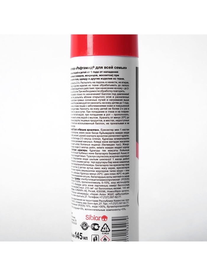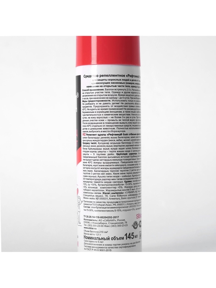 Способ применения: Использовать при температуре не ниже плюс 10°С. Перед применением баллон встряхивать в течение 2-3 секунд. Средство распылить на ладонь и нанести, не втирая, на открытые части тела; одежду и другие изделия из ткани обрабатывать до легкого увлажнения на открытом воздухе (в защищенном от ветра месте). Располагать одежду и направлять струю средства по направлению ветра. Средство распылять на изделия с расстояния 20-25 см от них, держа упаковку на вытянутой руке. После обработки одежду просушить. Время защитного действия: от насекомых при нанесении на кожу - до 4 часов, при нанесении на одежду и изделия из ткани - до 20 суток. Для увеличения длительности защитного действия обработанную одежду хранить в полиэтиленовом пакете. Меры предосторожности: Использовать средство только по назначению! Баллон под давлением! Не разбирать и не давать детям! Не распылять вблизи открытого огня и раскаленных предметов. Предохранять от воздействия прямых солнечных лучей и нагревания выше 40? С. Не курить во время применения! Не наносить на кожу детям (до 18 лет), беременным и кормящим женщинам, а также лицам с заболеваниями кожи и повышенной чувствительностью к химическим веществам. При попадании в глаза вызывает выраженное раздражение. Не допускать попадания в органы дыхания, рот, глаза и на поврежденные участки кожи. При попадании в глаза - промыть водой и закапать 30% раствор сульфацила натрия, при попадании в рот - прополоскать, в органы дыхания - вывести на свежий воздух. Наносить на кожу не более 2 раз в сутки. Для обработки одежды одному человеку использовать баллоны общим объемом не более 300 мл в сутки. Повторную обработку проводить не чаще чем через 3 суток. Не обрабатывать одежду на человеке и не надевать ее до полного высыхания. После возвращения в помещение смыть средство с обработанной кожи. Избегать попадания средства на синтетические ткани, пластмассовые изделия, окрашенные и лакированные поверхности. Условия хранения: Хранить средство при температуре от минус 20 С до плюс 40 С отдельно от лекарственных средств и пищевых продуктов, в местах, недоступных для детей и домашних животных. Полностью использованный баллон, не прокалывая и не сжигая, выбросить в места сбора мусора. Состав: N, N - диэтил-м-толуамид (ДЭТА) - 10%, диметилфталат (ДМФ) - 5%, (спирт входящий в рецептуру) > 30%, пропеллент углеводородный > 30%, функциональные добавки < 5%, отдушка < 5%.