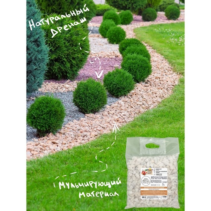 Мраморная крошка — естественный природный материал. Белая, отборная мраморная крошка применяется для всевозможных элементов приусадебного дизайна.