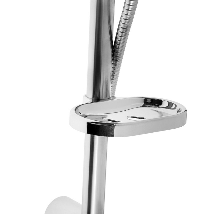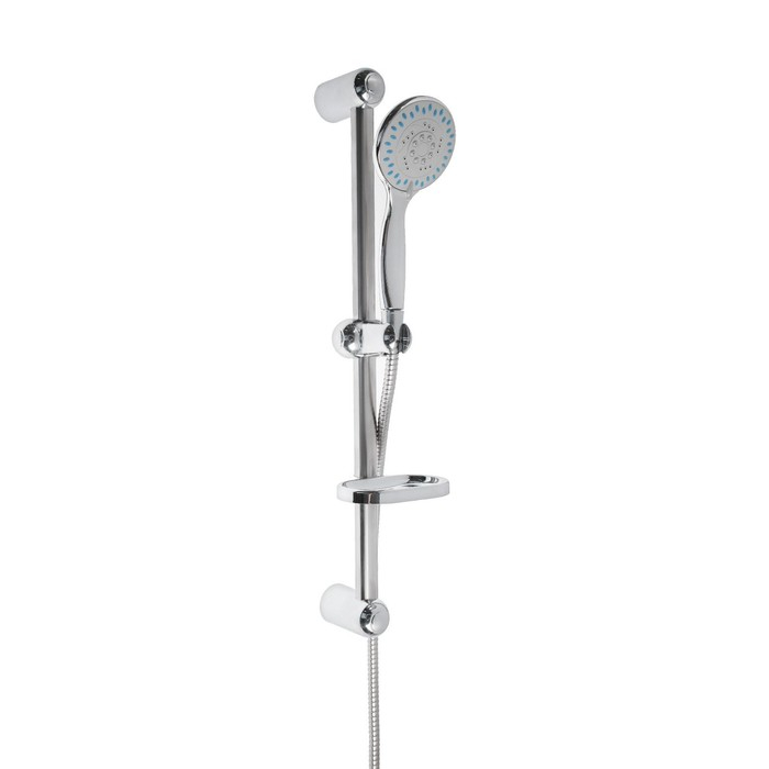Ручная лейка обеспечивает возможность создания пяти режимов конфигурации водяного потока простым поворотом сопла. Элементы крепления к стене скрыты. На штанге кроме кронштейна для душа имеется мыльница.