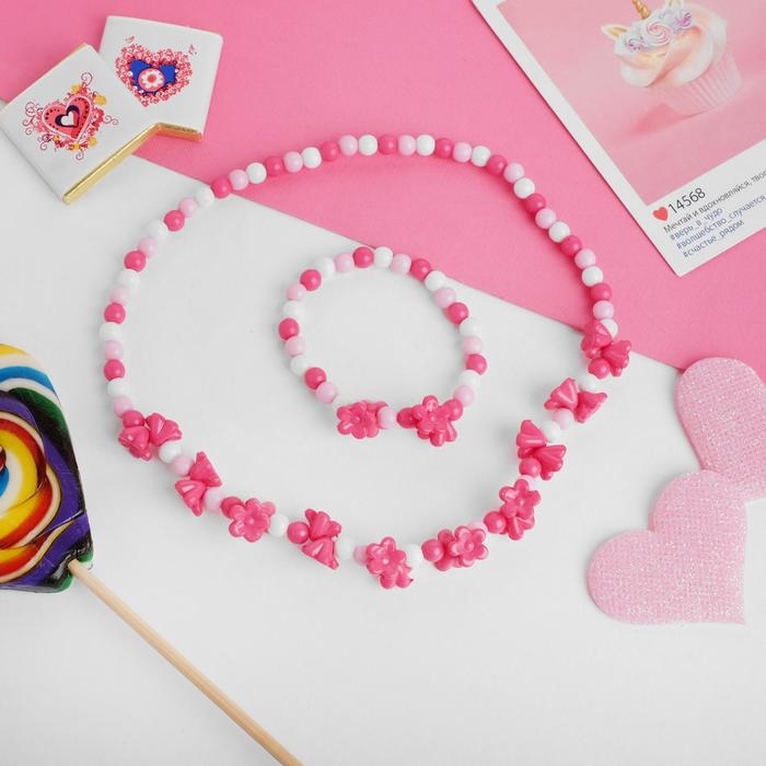Комплект детский «Выбражулька» 5 предметов: 2 резинки, бусы, браслет, кольцо, цветочек, цвет розовый