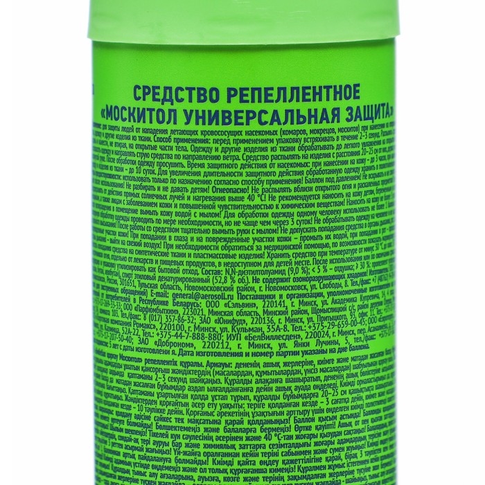 Современное средство для защиты от укусов комаров, мокрецов, москитов и других насекомых. Равномерно распыляется как на открытые участки кожи, так и для большей эффективности — на одежду. Приятный аромат лимона. Время действия — до 3 часов. Средство подходит для всей семьи. Не оставляет жирных следов на одежде. Состав:N,N-diethyltoluamide (10.0 %); < 5 %: parfum, triethyleneglycol$ ≥ 30 %: hydrocarbon propellent (propane, butane, iso-butane), denatured ethyl alcohol (51,6 %).