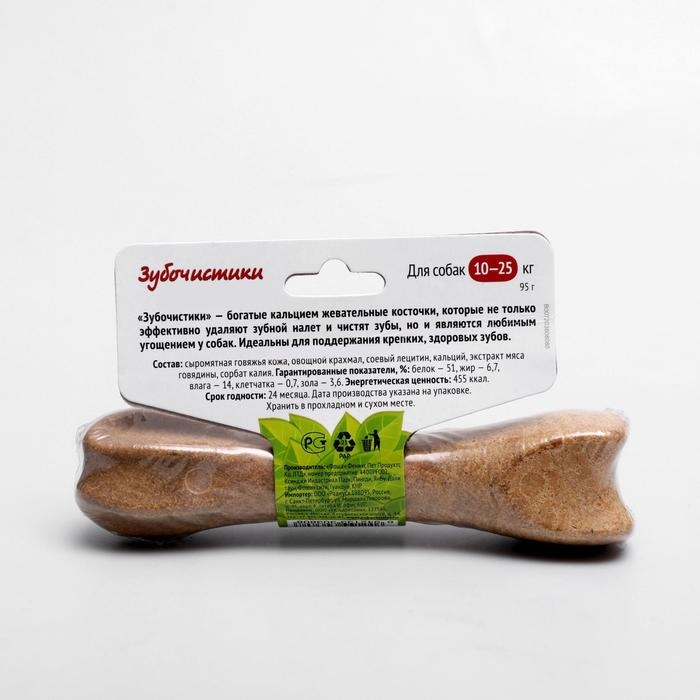 Запатентованная структура делает косточку достаточно жесткой, что обеспечивает максимально эффективную чистку зубов, сопоставимую с механической. Существенное содержание кальция укрепляет кости и зубы собаки.