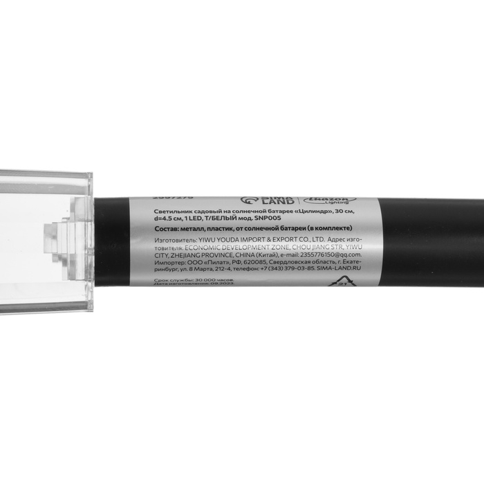 Садовый светильник на солнечной батарее «Цилиндр», 4.5×30×4.5 см, 1 LED, свечение тёплое белое
