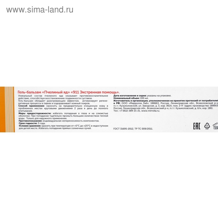 Гель-бальзам для суставов 911 «Пчелиный яд», 100 мл