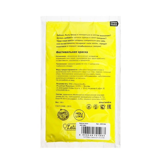Краска холи, цвет жёлтый, 100 г