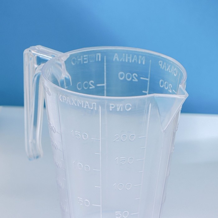 Ёмкость имеет эргономичную ручку и шкалу с делениями для сахара, муки и жидкостей. Изделия хорошо штабелируются и не занимают много места при хранении.