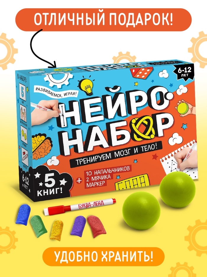 Этот набор сочетает теорию и практику, предлагая ребёнку не только читать и выполнять задания, но и работать с физическими объектами. Сенсорные мячики и нейронапальчники тренируют мелкую моторику, а книги развивают логическое мышление и знания об окружающем мире. Упражнения разработаны коллективом авторов с учётом потребностей детей младшего школьного возраста.