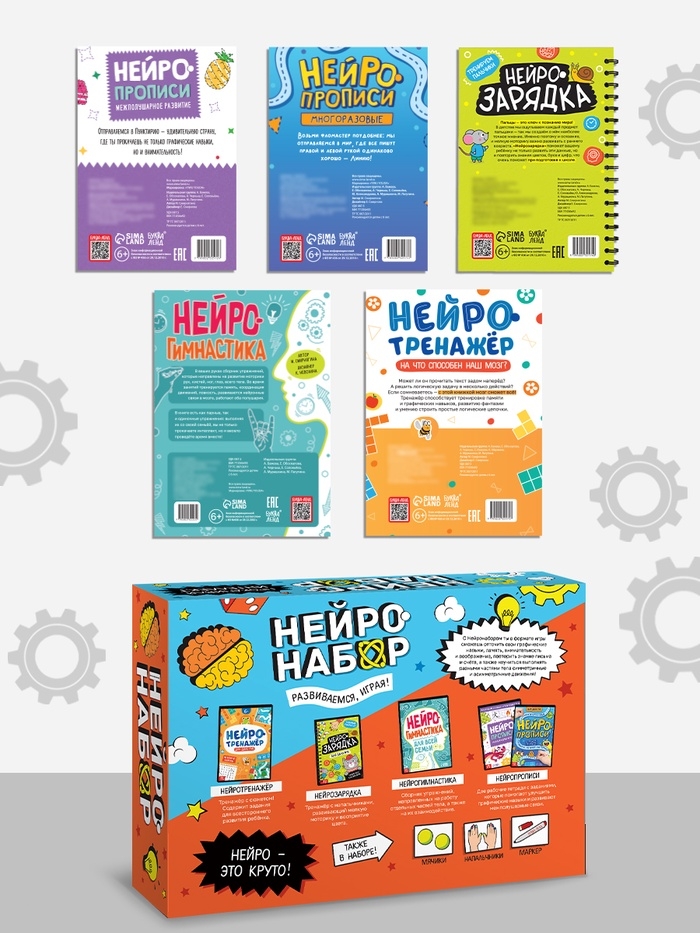 - Книги: «Нейрогимнастика», «Нейротренажёр», «Нейрозарядка», многоразовые прописи и нейропрописи.