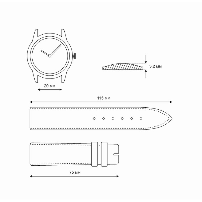 Ремешок для часов, мужской, 20 мм, запряжник 75 мм, горт 115 мм, натуральная кожа, чёрный