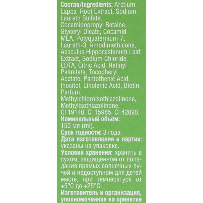 Состав: Arctium Lappa Root Extract, Sodium Laureth Sulfate, Cocamidopropyl Betaine, Glyceryl Oleate, Cocamid MEA, Polyquaternium-7, Laureth-3, Amodimethicone, Aesculus Hippocastanum Leaf Extract, Sodium Chloride, EDTA, Retinyl Palmitate, Tocopheryl Acetate, Pantothenic Acid, Inositol, Linolenic Acid, Biotin, Parfum, Methylchloroisothiazolinone, Methylisothiazolinone, CI 19140, CI15985, CI42090.