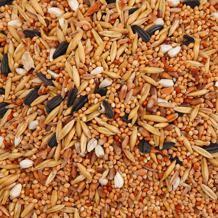 Просо жёлтое, овёс, пшеница, просо красное, овсянка, сафлор, семечка чёрная, яблоко, лён.
