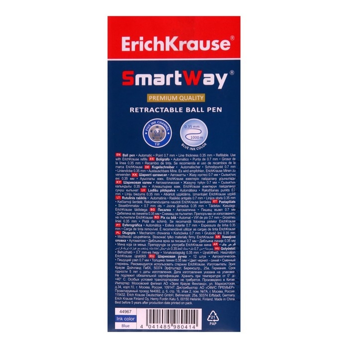 Классическая автоматическая шариковая ручка с металлическим клипом, стандартным типом пишущего узла и заменяемым стержнем. Ручка имеет непрозрачный, глянцевый круглый корпус синего цвета. 5-канальный пишущий узел с диаметром шарика 0.7 мм в сочетании с быстросохнущими чернилами обеспечивает мягкое и быстрое письмо. Длина непрерывной линии составляет 1000 м при толщине 0.35 мм, что является высоким показателем в своей категории. Новинка 2019 года ручка Smart® имеет строгую, классическую форму и рекомендована офисным сотрудникам в качестве надежной ручки для повседневного использования.