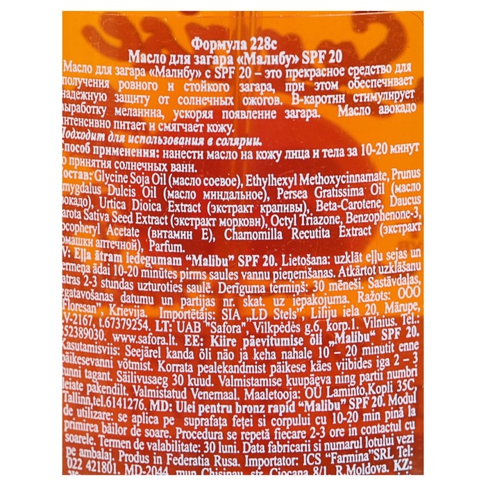 Витаминизированное косметическое масло c экстрактом моркови и маслом авокадо является прекрасным средством для быстрого получения и усиления загара. Способ применения: перед применением интенсивно встряхнуть флакон с маслом, затем нанести масло на кожу лица и тела за 10-20 минут до принятия солнечных ванн. Состав: Aqua, Mineral Oil, Glycine Soja Oil, Cyclomethicone, Isopropyl Palmitate, Propylene Glycol, Persea Gratissima Oil, Daucus Carota Extract, Sodium Citrate, Parfum, Benzyl Alcohol, Methylchloroisothiazolinone, CI 15980, CI 15525, CI 26100.