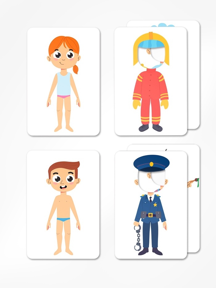 - Подбор костюма: Прикрепите с помощью липучек соответствующий костюм к двухсторонней карте с человеком.