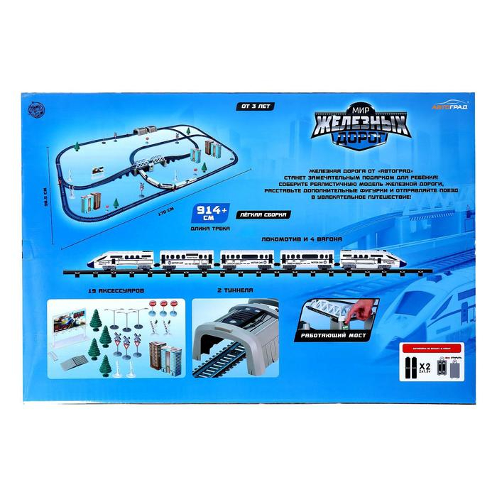 Теперь стать машинистом в мегаполисе может каждый желающий! Игровой набор «Экспресс» — это большая железная дорога со скоростным поездом. Во время своего путешествия локомотив пройдёт несколько развилок, перекрёсток, два туннеля и даже мост над путями. Сделайте остановку на станции, посадите пассажиров и отправьтесь в очередной рейс!
