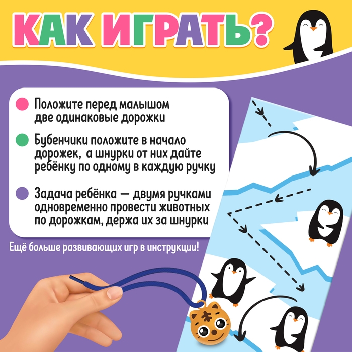 - Задача ребёнка — двумя ручками одновременно провести животных по дорожкам, держа их за шнурки.