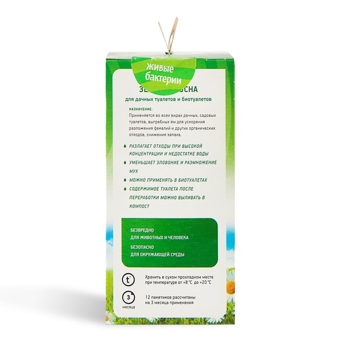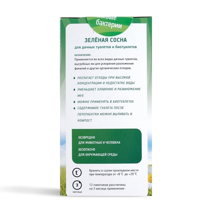 ЗЕЛЕНАЯ СОСНА разжижает отходы жизнедеятельности и разлагает их на нейтральные составляющие. Уже через 4 часа после применения неприятный запах существенно снижается. Бактерии, входящие в состав препарата, активно работают при недостатке воды и высоких концентрациях отходов.