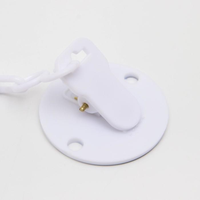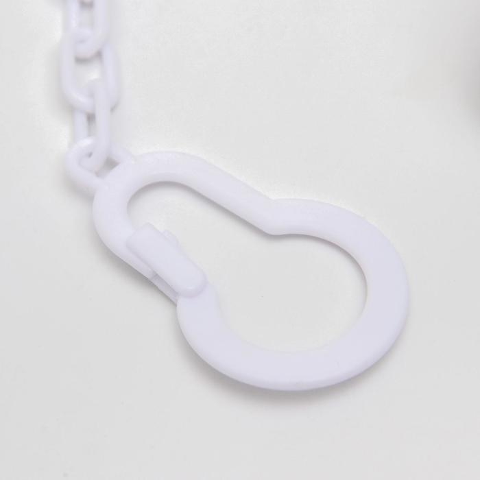 Изделие фиксируется на одежде ребёнка. На конце цепочки есть карабин, который зацепляется за кольцо пустышки. Надёжное крепление убережёт вещь от падения на пол, если малютка случайно выронит её изо рта.
