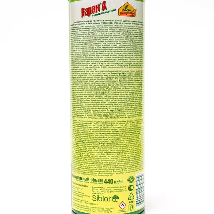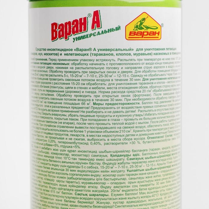 На природе и дома многие люди сталкиваются с клещами, клопами, москитами и другими опасными насекомыми, которые способны причинить массу вреда. Они переносят инфекцию, пьют вашу кровь и просто раздражают своим внешним видом. Вы устали бороться с ними? Дихлофос от торговой марки «Варан» — высокоэффективное средство для уничтожения ползающих (тараканов, муравьёв, клопов и т. д.), а также летающих насекомых (мух, москитов, комаров). Способ применения: перед использованием хорошо взболтайте, распылите. Состав: тетраметрин 0,12 %, циперметрин 0,2 %, пиперонилбутоксид 0,4 %, отдушка менее 5 %, функциональные добавки менее 5 %, смесь бутан / пропан / изобутан более 30 %, растворители более 30 %. Способ применения: перед использованием хорошо взболтайте, распылите.