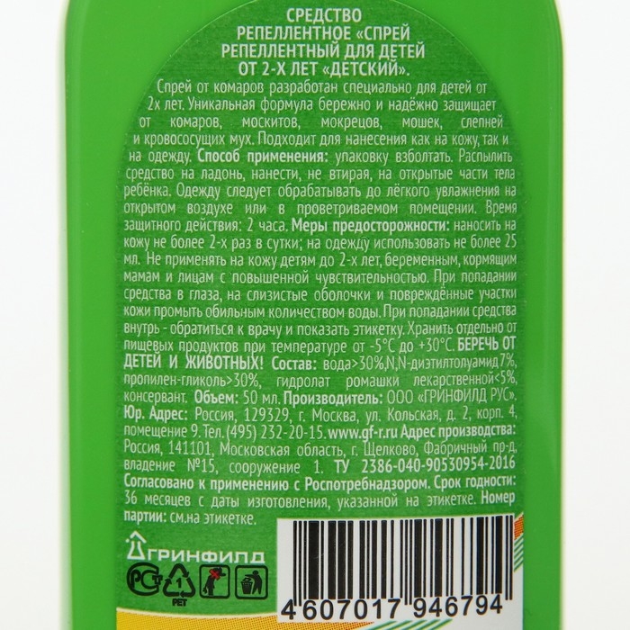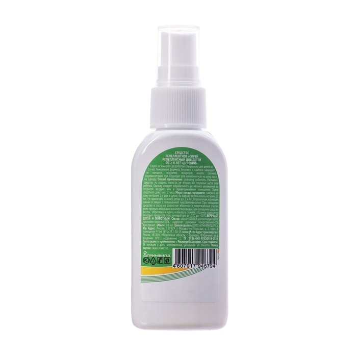 Спрей от комаров разработан специально для детей от 2х лет. Уникальная формула бережно и надёжно защищает от комаров, москитов, мокрецов, мошек, слепней и кровососущих мух. Подходит для нанесения как на кожу, так и на одежду.Способ применения: упаковку взболтать. Распылить средство на ладонь, нанести, не втирая, на открытые части тела ребёнка. Одежду следует обрабатывать до лёгкого увлажнения на открытом воздухе или в проветриваемом помещении. Время защитного действия: 2 часа.Состав: N,N-диэтилтолуамид 7%, гидролат ромашки лекарственной, пропиленгликоль, консервант, вода.Товар находится в категориях