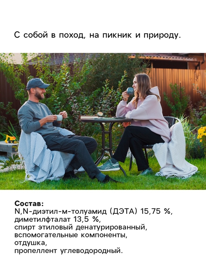 "Репеллент ""Леший"" разработан для обеспечения надежной защиты от укусов клещей и других кровососущих насекомых. При использовании средства на коже обеспечивается защита на срок до 4 часов, а при обработке одежды эффект увеличивается до 5 суток против клещей и до 30 суток против остальных насекомых.Специальный состав репеллента, включающий альфациперметрин и имипротрин, успешно отпугивает насекомых, не вызывая при этом сильного отторжения у людей благодаря приятному ванильному аромату.Помимо высокой эффективности, средство удобно в использовании благодаря форме выпуска в виде аэрозоля, что позволяет равномерно распределить его на поверхности кожи и одежды."Состав:N,N-диэтил-м-толуамид (ДЭТА) 15,75%,диметилфталат 13,5%,бутан/пропан/изобутан смесь >30%,спирт этиловый денатурированный 15-30%,глицерин <5%,натрий тетраборнокислый <5%.Способ примененияПеред применением встряхнуть. Распылить средство на ладонь и нанести, не втирая, на открытые части тела. Одежду обрабатывать на открытом воздухе в защищенном от ветра месте с расстояния 20-25 см до легкого увлажнения.