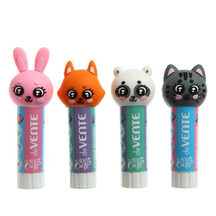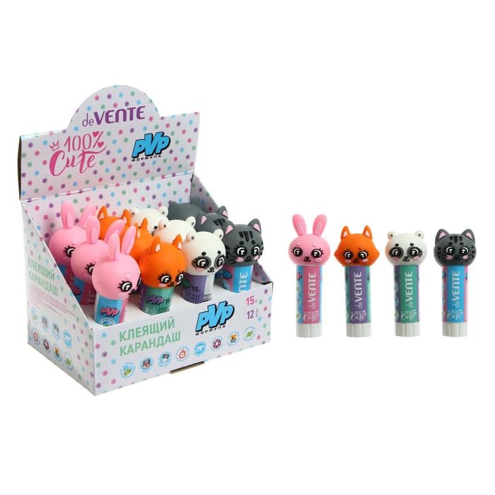 Клеящий карандаш PVP основа "deVENTE. 100% Cute" 15 грамм, (быстросохнущий) с фигуркой на колпачке, в картонном дисплее с пластиковым поддоном, ассорти