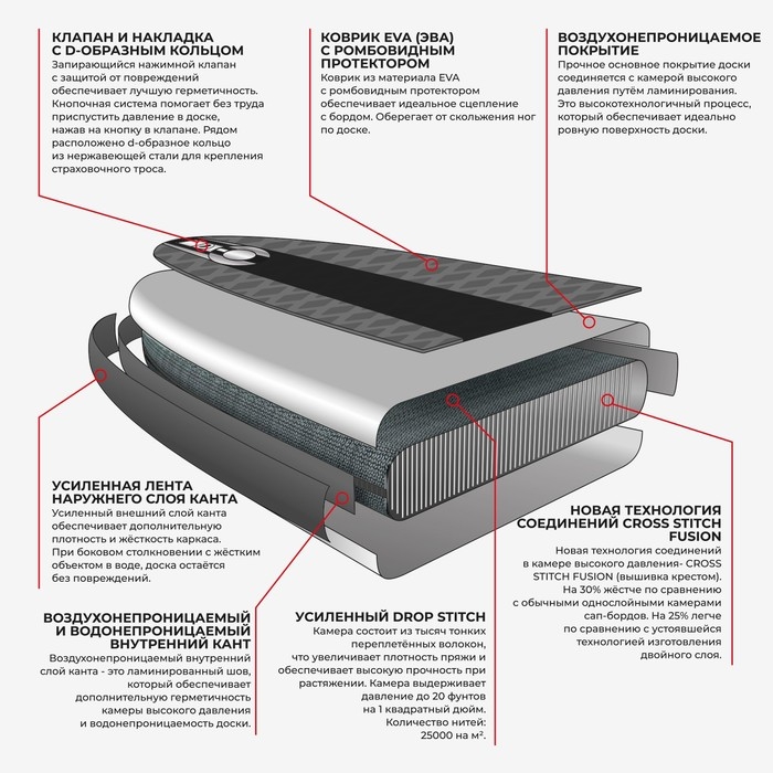 - При изготовлении сап-борда использована технология DROP STITCH — камера состоит из множества переплетённых тонких волокон. Это придаёт изделию жёсткость по всей длине. Увеличенная плотность пряжи обеспечивает высокую прочность на растяжение. Камера выдерживает давление до 20 фунтов на 1 квадратный дюйм. Количество нитей: 25 000 на м².