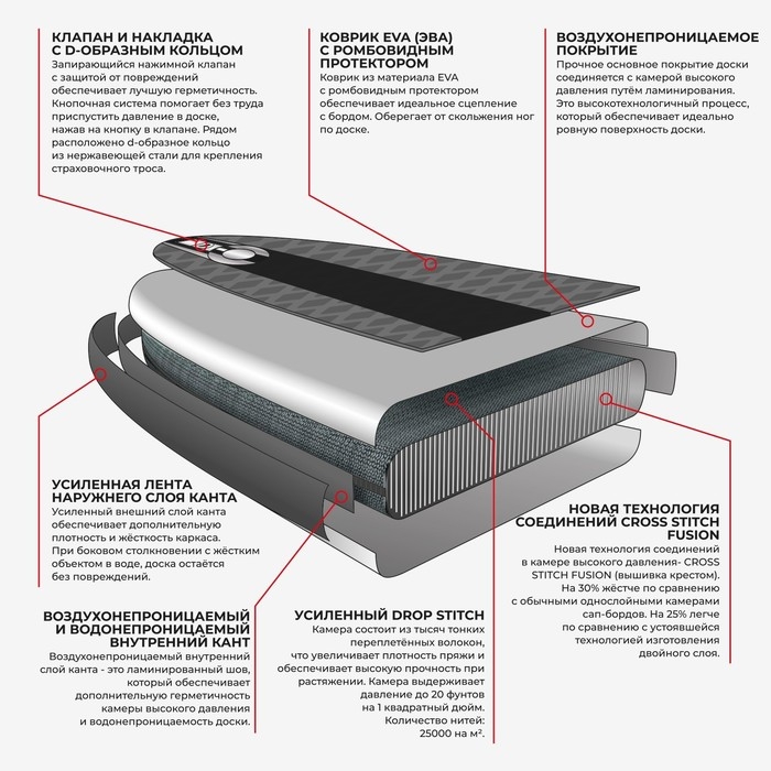- Новая технология соединений в камере высокого давления — CROSS STITCH FUSION (вышивка крестом). В результате камера на 30 % жёстче по сравнению с обычными однослойными камерами SUP-досок. И на 25 % легче камер с устоявшейся технологией изготовления двойного слоя.
