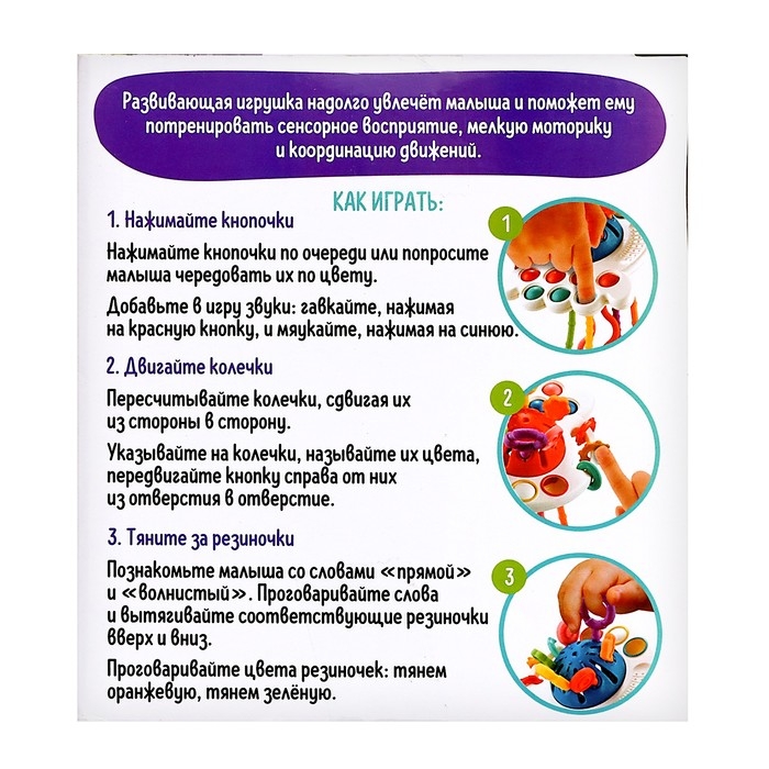 Развивающая игрушка «Осьминожка» разработана специально для малышей от 1 года. С такой игрушкой ребёнок потренирует сенсорное восприятие, мелкую моторику, координацию движений и логическое мышление.