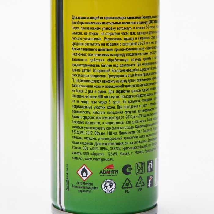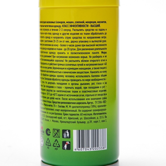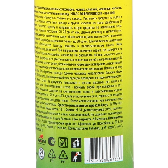 Описание:Аэрозоль (репеллентный) от комаров ARGUS предназначен для защиты людей от кровососущих насекомых (комаров, мошек, слепней, мокрецов, москитов, блох) при нанесении на открытые части тела и на одежду. Класс эффективности - высший. Время защитного действия при нанесении на кожу - более 4 часов даже при высокой численности насекомых, при нанесениии на одежду и изделия из ткани - до 20 суток.Меры предосторожности:Баллон под давлением!При нагревании возможен взрыв.Не разбирать и не давать детям! Осторожно! Воспламеняющийся аэрозоль! Не распылять вблизи открытого огня и раскаленных предметов. Предохранять от действия прямых солнечных лучей и нагревания выше 40 градусов. Не рекомендуется наносить на кожу детям, беременным и кормящим женщинам, а также лицам с заболеваниями кожи и повышенной чувствительностью к химическим веществам. Наносить на кожу не более 2 раз в сутки. Для обработки одежды одному человеку использовать баллоны общим объемом не более 300 мл в сутки. Повторную обработку одежды проводить по мере необходимости -но не чаще, чем через 3 суток. Не допускать попадания в органы дыхания, рот, глаза и на поврежденные участки кожи. При попадании в глаза- промыть водой, при попадании в рот-прополоскать. Состав: М, М-диэтилтолуамид(18%), пропиленгликоль, отдушка, углеводородный пропеллент, спирт изопропиловый