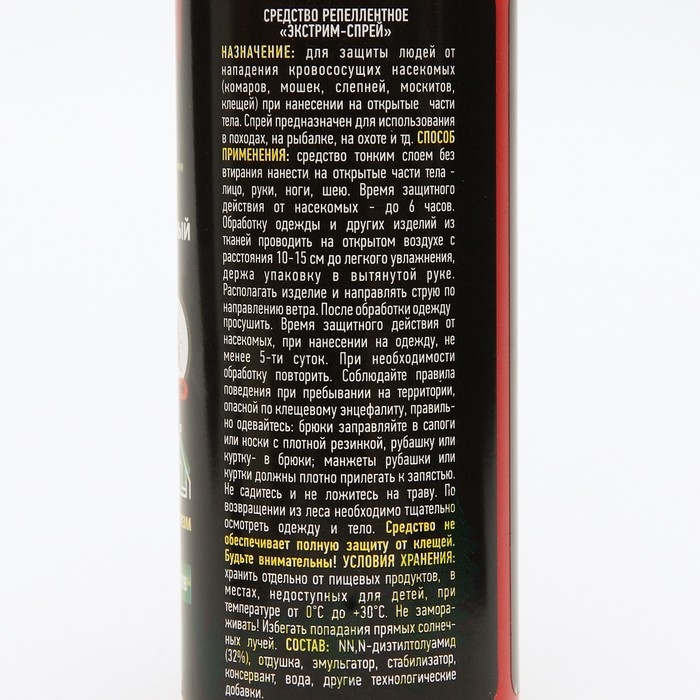 Описание:Для защиты людей от нападения кровососущих насекомых (комаров, клещей, мокрецов, москитов, слепней) при нанесении на открытые части тела. EXTREME Лосьон-спрей идеально подойдет для защиты от комаров в экстримальных условиях: на рыбалке, охоте, отдыхе. Защитит от насекомых в лесу, в тайге, в горах, в районах с повышенной влажностью.Способ применения:Средство тонким слоем без втирания нанести на открытые части тела - лицо, руки, ноги, шею. Время защитного действия от насекомых - до 6 часов. При необходимости обработку повторить.Состав: NN, N-диэтилтолуамид(32%), отдушка, эмульгатор, стабилизатор, консервант, вода и другие технологические добавки