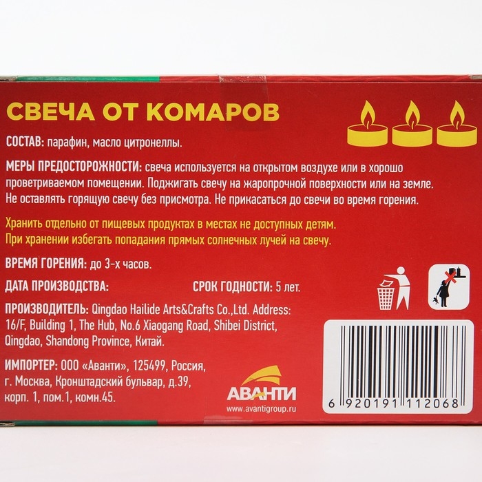 Описание:Бдительный страж свечи от комаров с запахом цитронеллы 6 шт в упаковке.Меры предосторожности:Свеча используется на открытом воздухе или в хорошо проветриваемом помещении площадью 25 м3. Поджигать свечу на жаропрочной поверхности или на земле. Не оставлять горящую свечу без присмотра. Не прикасаться до свечи во время горения. Хранить отдельно от пищевых продуктах в местах не доступных детям. При хранении избегать попадания прямых солнечных лучей на свечу.Время горения до 3 часов. Состав: парафин , масло цитронеллы