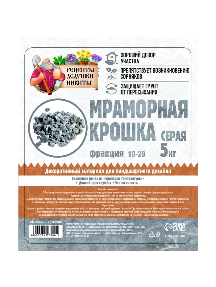 Мраморная крошка "Рецепты Дедушки Никиты", серая, фр 10-20 мм , 5 кг