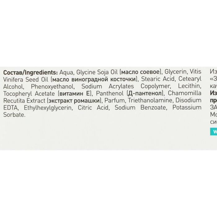 Состав: Aqua, Glycine Soja Oil (масло соевое), Glycerin, Vitis Vinifera Seed Oil (масло виноградной косточки), Stearic Acid, Cetearyl Alcohol, Phenoxyethanol, Sodium Acrylates Copolymer, Lecithin, Tocopheryl Acetate (витамин Е), Panthenol (Д-пантенол), Chamomilla Recutita Extract