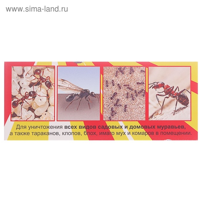 Эффективно уничтожает муравьев в теплицах, парниках, хозяйственных постройках. Уничтожает домовых муравьев (в т. ч. фараоновых муравьев) в индивидуальных и многоквартирных жилых домах.