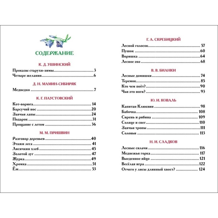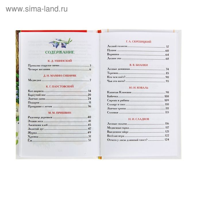 В книгу вошли произведения: К. Ушинского «Проказы старухи зимы», «Четыре желания», Д. Мамина-Сибиряка «Медведко», К. Паустовского «Кот Ворюга», «Барсучий нос», «Заячьи лапы», «Подарок», «Прощание с летом», М. Пришвина «Разговор деревьев», «Этажи леса», «Лисичкин хлеб», «Золотой луг», «Журка», «Хромка», «Еж», Г. Скребицкого «Лесной голосок», «Пушок», «Воришка», «Лесное эхо», В. Бианки «Лесные домишки», «Теремок», «Кто чем поет?», «Чьи это ноги?», Ю. Коваля «Капитан Клюквин», «Бабочка», «Сирень и рябина», «Солнце и снег», «Заячьи тропы», «Соловьи», Н. Сладкова «Лесные силачи», «Медвежья горка», «Выеденное яйцо», «Веселая игра», «Отчего у лисы длинный хвост?». Художники: В. Бастрыкин, Е. Володькина, В. Канивец, В. Коркин, Ю. Николаев, А. Остромецкий, К. Прыткова, К. Романенко, Н. Устинов.
