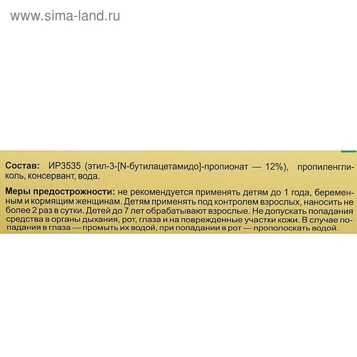 Содержит: ИР3535 (этил-3-[N-бутилацетамидо]-пропионат — 12%), пропиленгликоль, консервант, вода.
