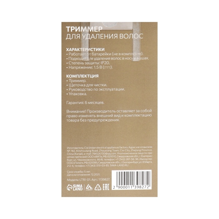 Триммер для волос Luazon LTRI-02, для носа/ушей, АКБ, золотистый
